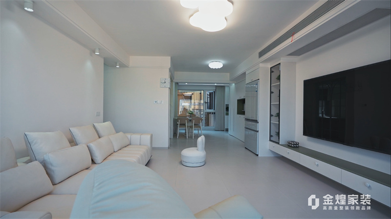 客廳內(nèi),大電視直接掛在墻上,下方配以簡約的電視柜,旁邊擺放著舒適的沙發(fā)和別致的休閑椅,沒有過多的繁雜裝飾,顯得寬敞又明亮。大窗戶的設(shè)計讓室內(nèi)光線充足,進(jìn)一步增強(qiáng)了空間的通透感。