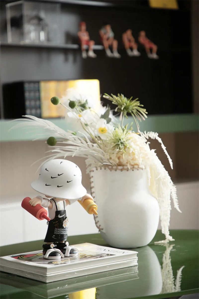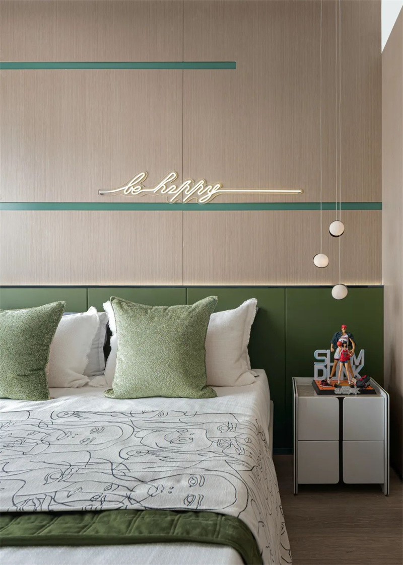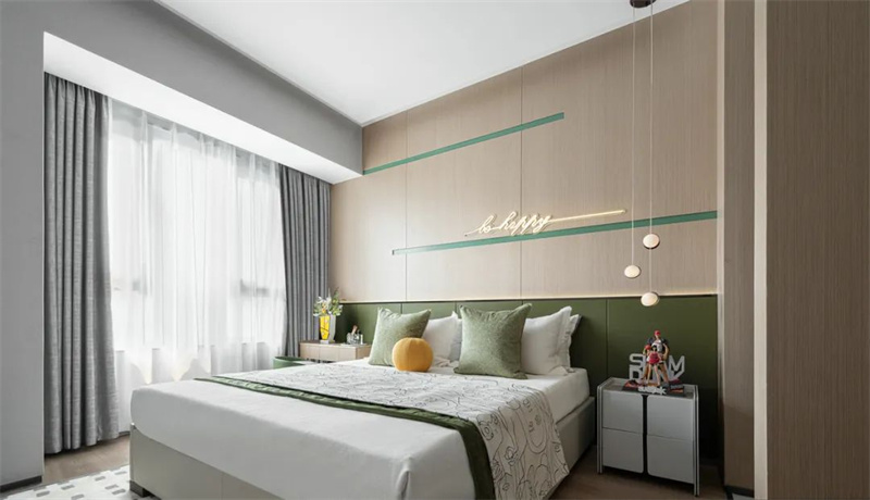 主臥,簡潔而溫馨的設(shè)計讓人放松。寬敞的大床搭配柔軟的床品,營造出舒適的休息空間。床頭背景墻采用淺木色與綠色相間的色調(diào),既時尚又充滿生機。兩側(cè)對稱擺放的白色床頭柜設(shè)計簡約實用,上面擺放著綠植和裝飾品,增添幾分生活氣息。
