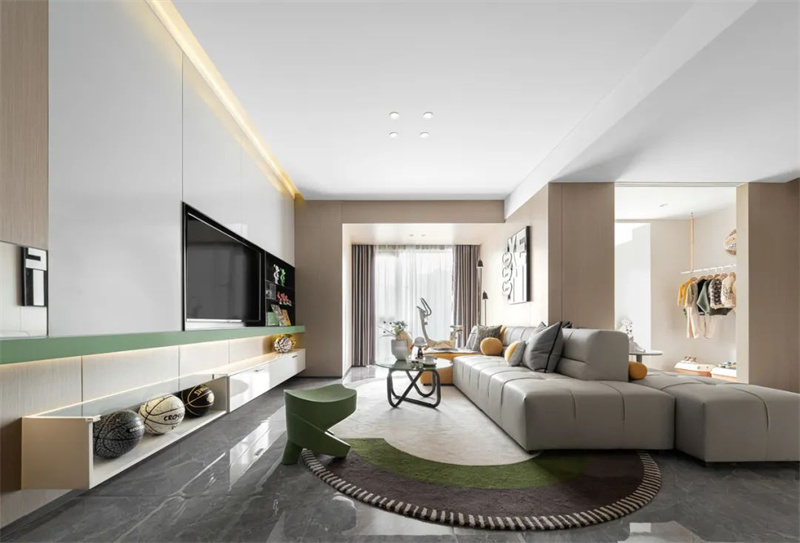 客廳,寬敞明亮的空間布局讓人感到格外舒適。L型灰色皮質(zhì)沙發(fā)搭配色彩各異的靠墊,既實用又美觀。電視墻采用了嵌入式電視機與白色儲物柜的設(shè)計,既節(jié)省空間又提升了整體現(xiàn)代感。精心設(shè)計的燈具提供均勻柔和的照明,使整個空間更加溫馨。