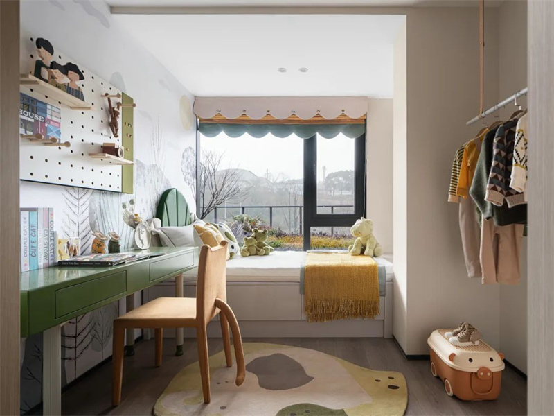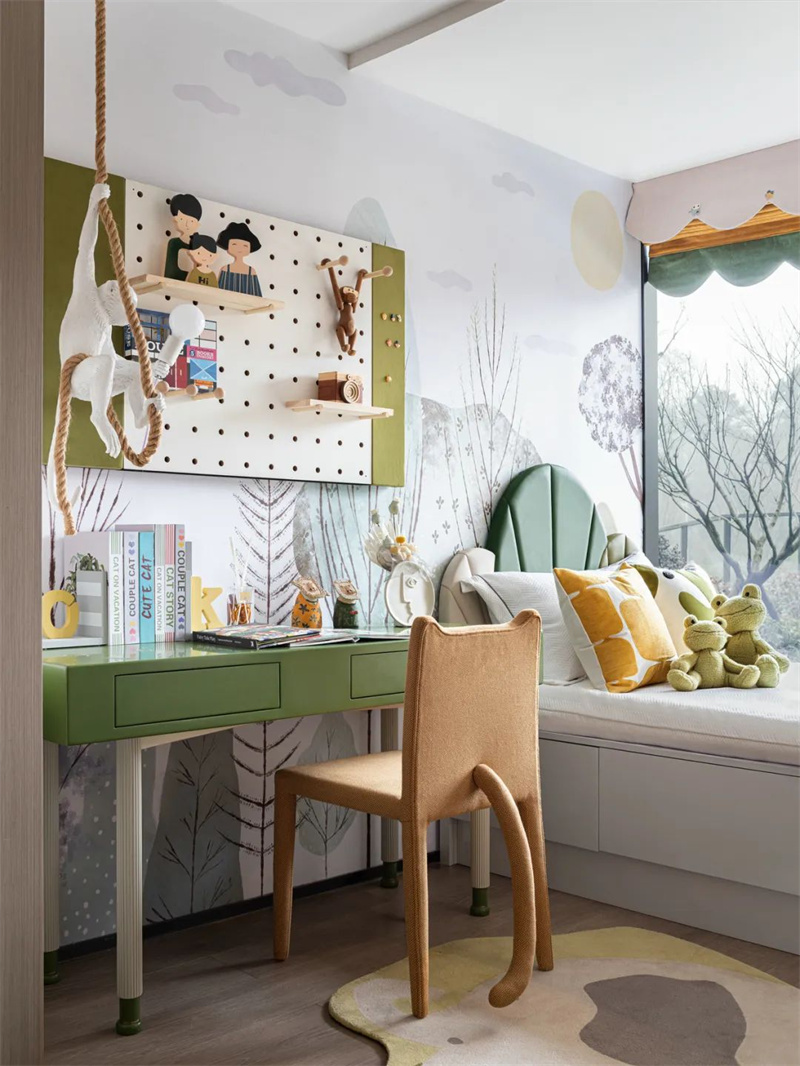 兒童房墻上可愛的卡通圖案和云朵壁畫,營造出夢幻般的氛圍。綠色學(xué)習(xí)桌搭配木質(zhì)椅子,為孩子提供了一個既實用又美觀的學(xué)習(xí)空間。大窗戶讓充足的自然光進入房間,使整個空間更加明亮通透。孩子們可以在這里安全地玩耍、學(xué)習(xí),享受成長的樂趣。