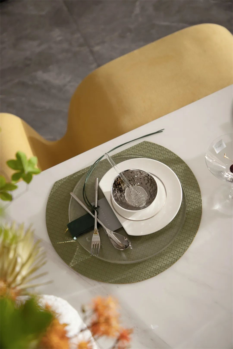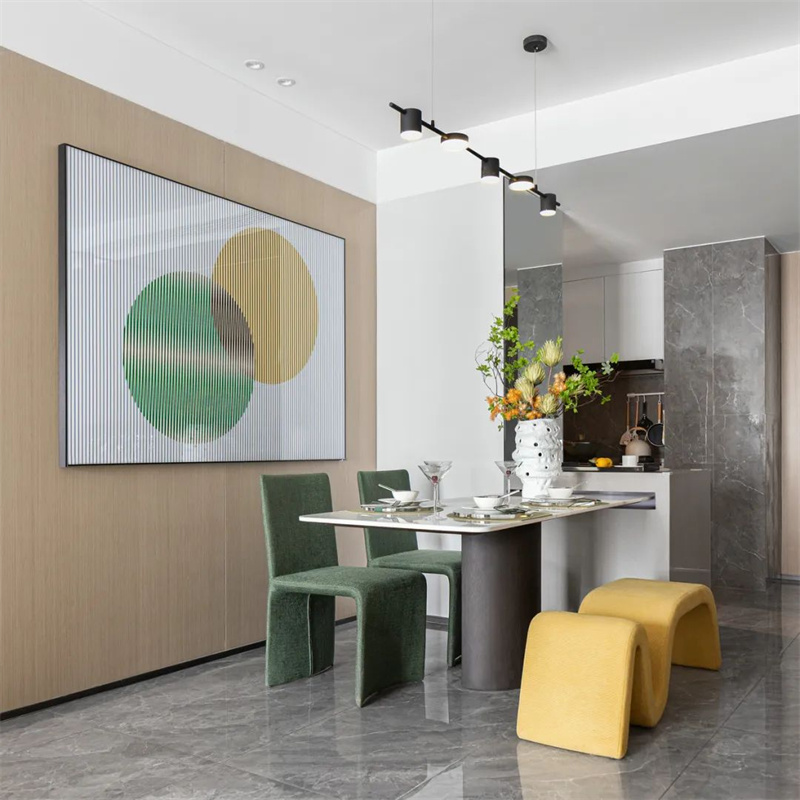 餐廳,簡潔而優(yōu)雅的設(shè)計讓人眼前一亮。灰色大理石地板與淺色墻面形成鮮明對比,營造出清新高雅的氛圍。墻上的大幅抽象畫作成為視覺焦點,色彩鮮艷且富有藝術(shù)感,為整個空間注入了活力。