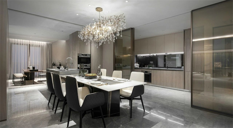 意式輕奢餐廳強調(diào)用餐空間的舒適和尊貴感。開放式的設(shè)計讓光線在餐廳與客廳間自由流動,整個空間視野明亮而通透,完美呈現(xiàn)了意式輕奢的優(yōu)雅格調(diào)與舒適居家體驗。