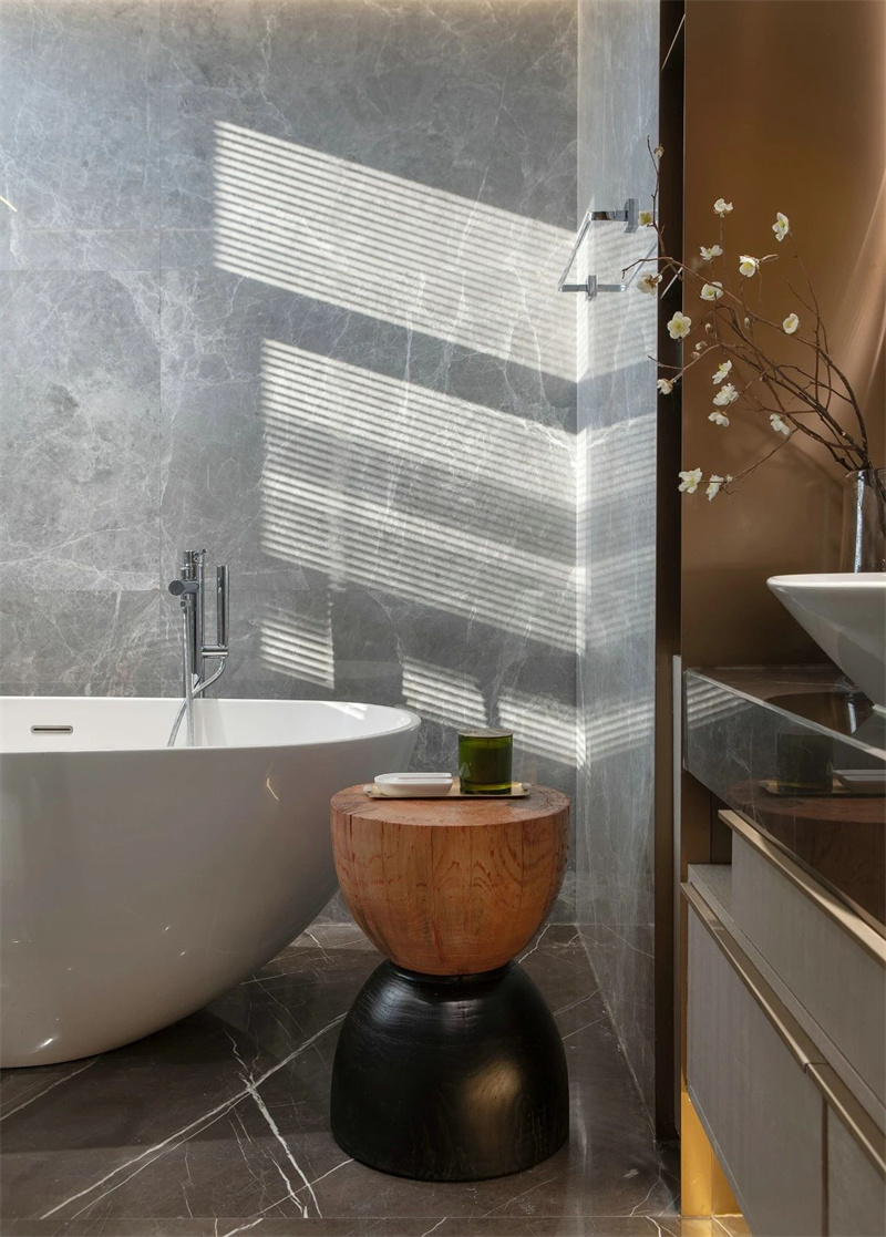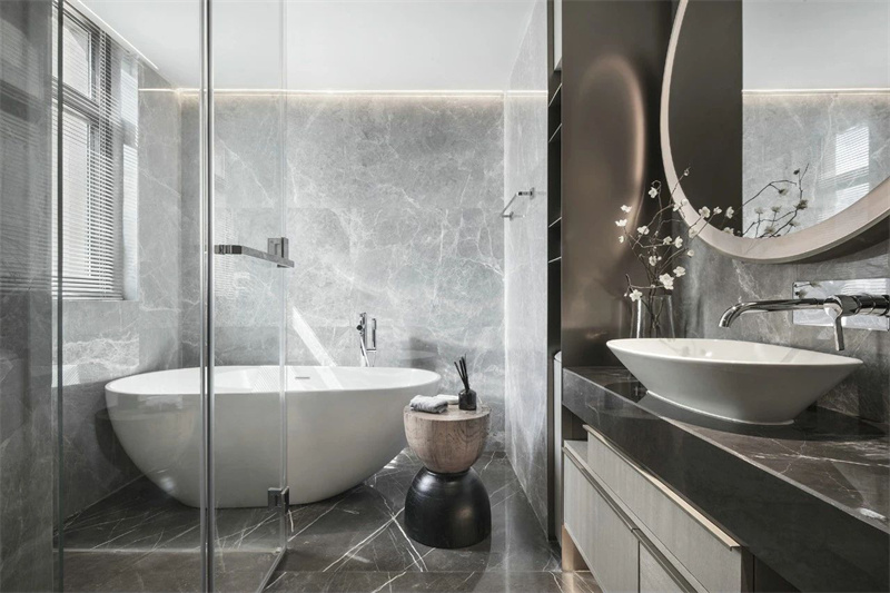 意式輕奢衛(wèi)生間追求精致和典雅。大理石地板和墻面的一體化設(shè)計營造出高貴的氛圍,獨特的衛(wèi)浴設(shè)計和華麗的浴室鏡不僅為其增添了藝術(shù)元素,也為每一次洗漱體驗注入了一份奢華與品味。