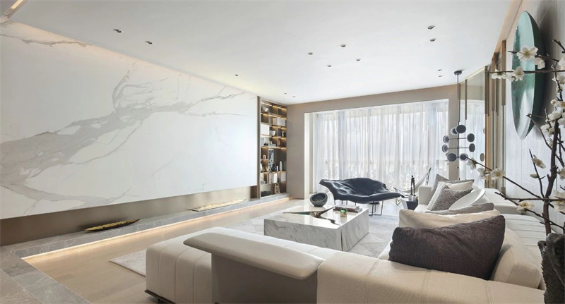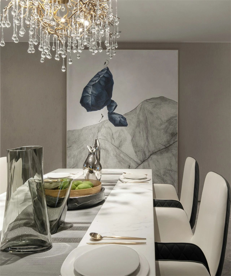 客廳以豪華和舒適為特點,注重細節(jié)和藝術(shù)品味。大理石地板和墻壁飾面營造出高貴的氛圍。精心挑選的藝術(shù)品、裝飾畫和收藏擺件,無不彰顯主人對生活品質(zhì)的追求和藝術(shù)品味的獨特表達。