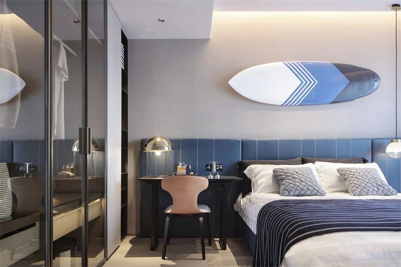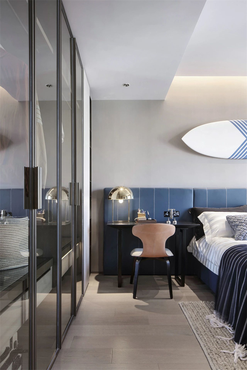 次臥以淺灰色為主色調(diào),搭配柔和的天藍色軟包床頭,給人一種溫馨時尚、舒適優(yōu)雅的視覺體驗。玻璃門衣柜是亮點,令所有衣物都明朗地呈現(xiàn)在眼前,讓收納從雜亂無章變得井井有條。