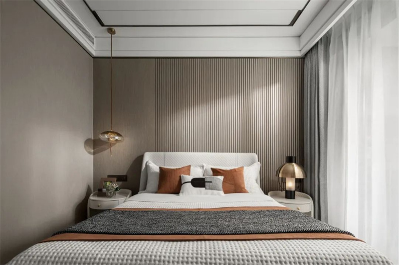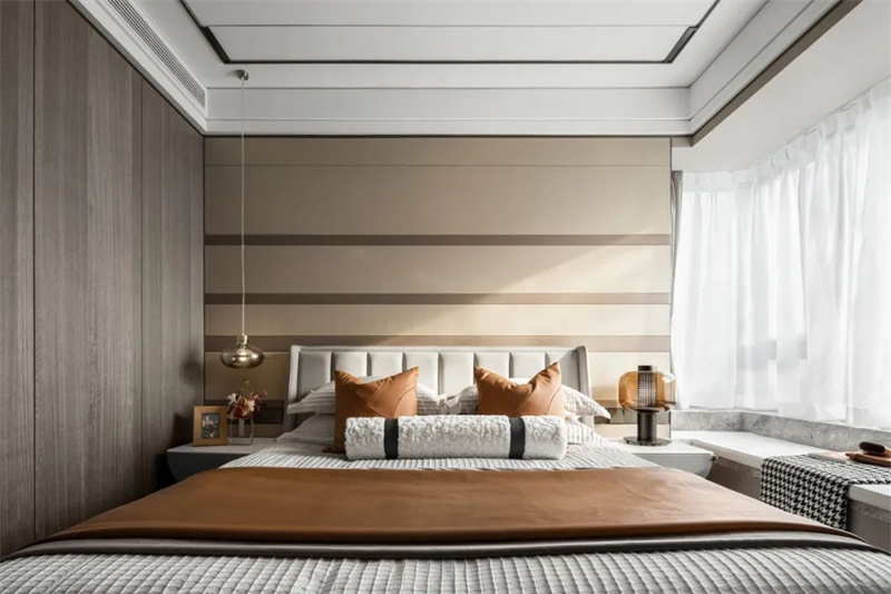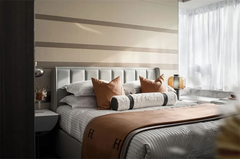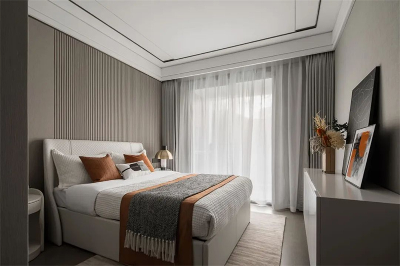 主臥色調(diào)以柔和的灰白為主,帶來寧靜而舒適的氛圍。床頭靠背采用暖色的軟包設(shè)計,簡潔卻極具質(zhì)感,與木色邊柜形成和諧的對比。超大窗戶帶來卓越的自然采光條件,同時擴(kuò)大了空間的視覺效果,為房間注入更多的明亮和開闊感。