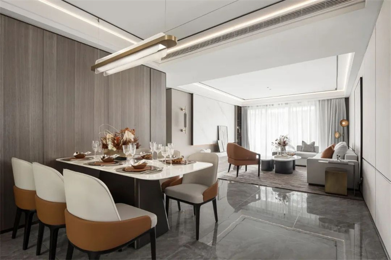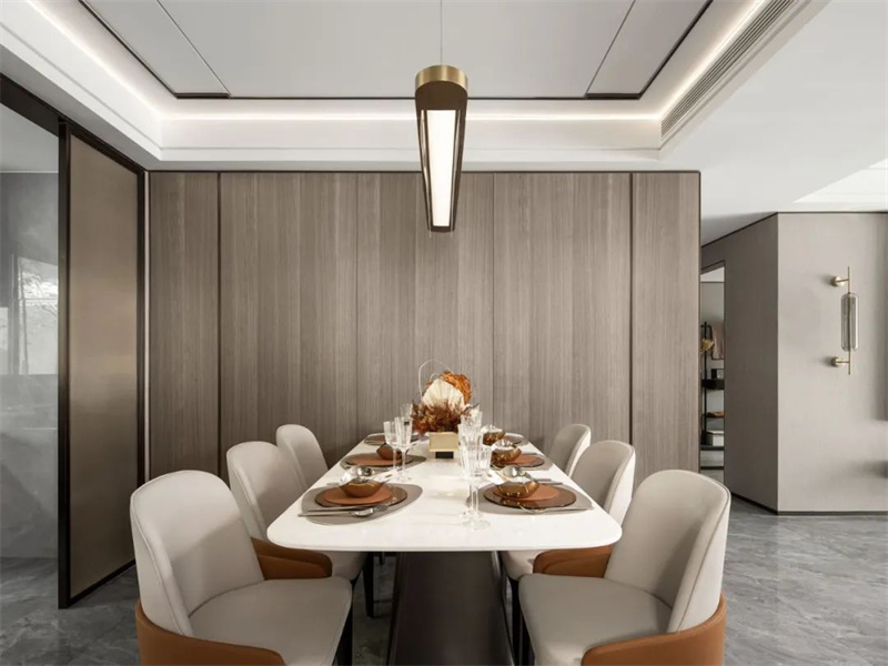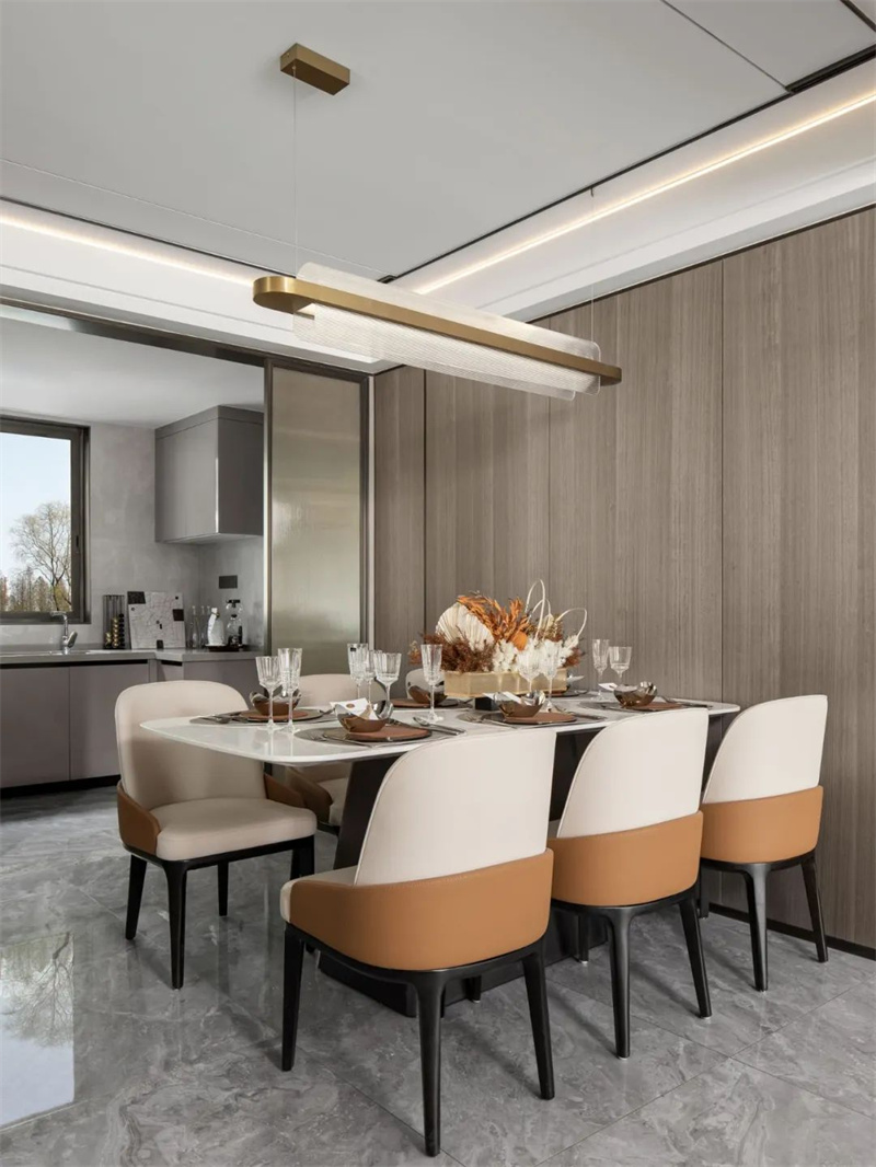 餐廳空間與客廳相連貫,整體寬度充足,居中擺放一套簡約巖板餐桌+舒適的皮藝餐椅,讓用餐氛圍輕松閑適。餐桌上的插花和素雅的餐具恰到好處地點綴著整體設(shè)計,既保留了簡約的美感,又增添了一抹生機(jī)和活力。