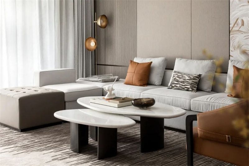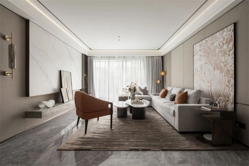 在客廳的設(shè)計中,采用簡約的家具和裝飾品,搭配簡約風(fēng)格的藝術(shù)裝飾和照明燈具,選擇中性色調(diào)和柔和的色彩搭配,營造出輕松宜人的氛圍。同時,充分利用空間,確保流線型布局,使客廳顯得更加開闊和通透。