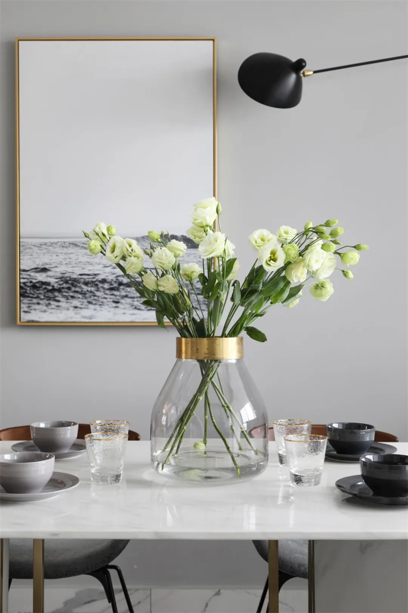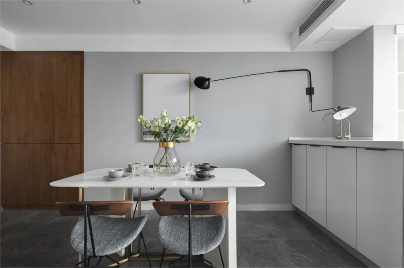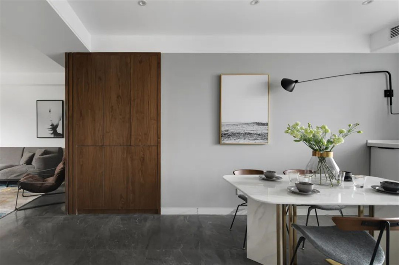 餐廳白色餐桌配灰色布藝餐椅,舒適又耐看,桌上的花束和餐具點(diǎn)綴出生活氣息。墻上的藝術(shù)畫和黑色壁燈提升了空間質(zhì)感,木質(zhì)儲(chǔ)物柜則增添了一絲自然溫暖。大窗戶引入自然光,讓整個(gè)區(qū)域明亮舒適,兼具美感與實(shí)用性。