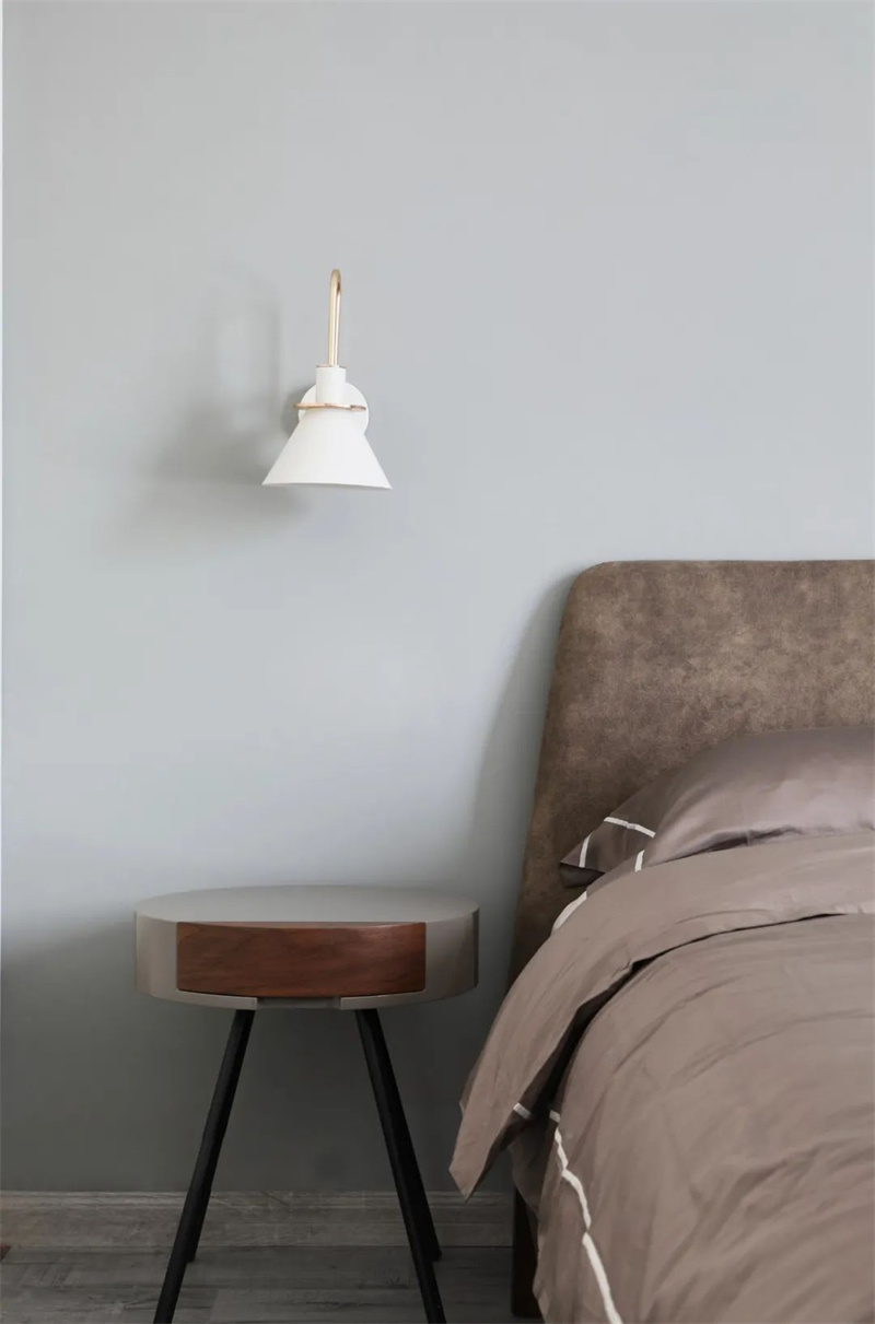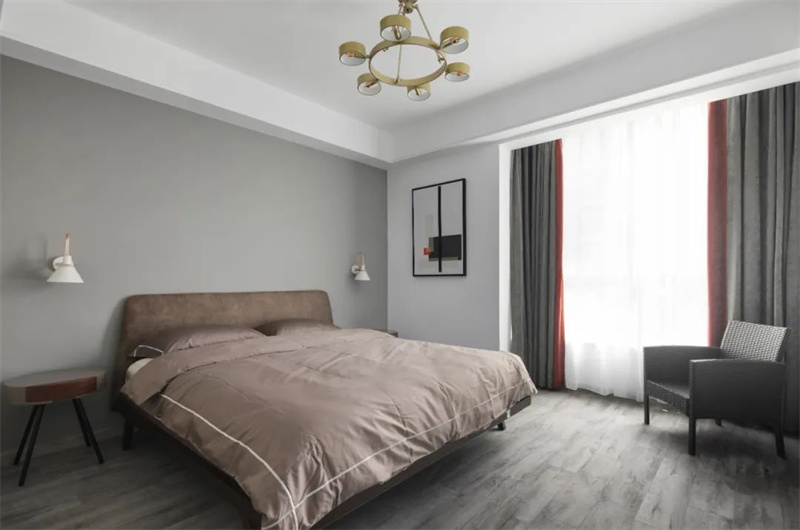 主臥簡約舒適,灰色木地板搭配淺色墻面,營造出寧靜放松的氛圍。深棕色軟包大床搭配同色系床品,溫暖協(xié)調(diào)。床頭兩側(cè)設(shè)有壁燈和小凳,方便實(shí)用,墻上一幅抽象畫增添藝術(shù)感,整體空間實(shí)用又溫馨。