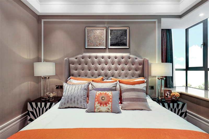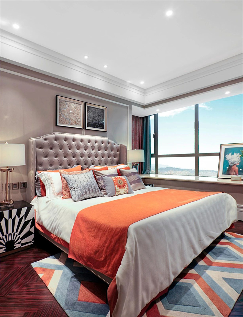 主臥中,優(yōu)雅與奢華交織成了一幅夢(mèng)幻的畫卷。床頭采用軟包設(shè)計(jì),柔軟的天鵝絨床品與大飄窗相互呼應(yīng),金屬邊框的鏡子與床頭柜上簡(jiǎn)約的臺(tái)燈為臥室增添了一絲現(xiàn)代感,同時(shí)保持輕奢的調(diào)性,使空間既舒適又不失格調(diào)。