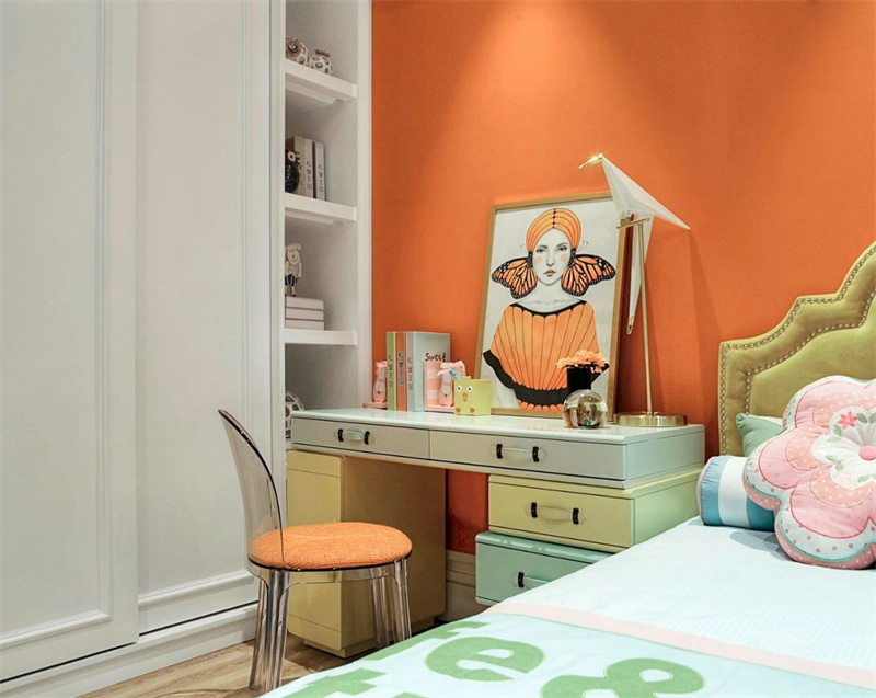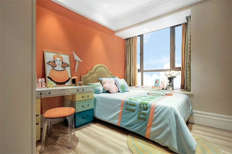 兒童房充滿溫馨與活力,設(shè)計(jì)簡(jiǎn)潔卻極具趣味性。房間的主色調(diào)以橙色為主,配合原木色地板,營(yíng)造出輕松愉快的氛圍。床頭設(shè)置了一張書桌,陽(yáng)臺(tái)明亮的光線灑入室內(nèi),為孩子提供了理想的學(xué)習(xí)和游戲區(qū)域,增添了童趣和活力。