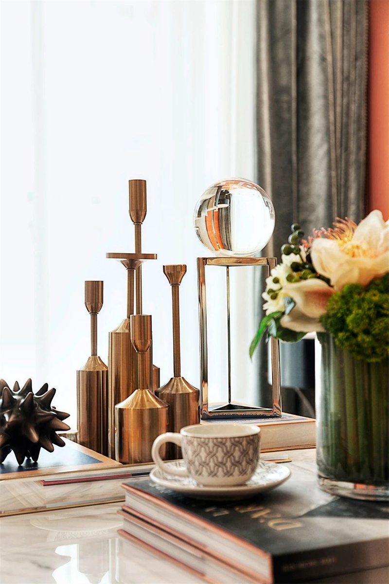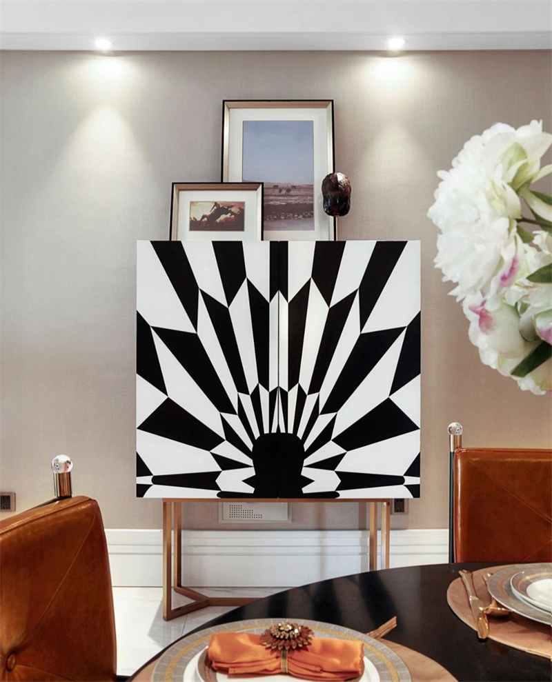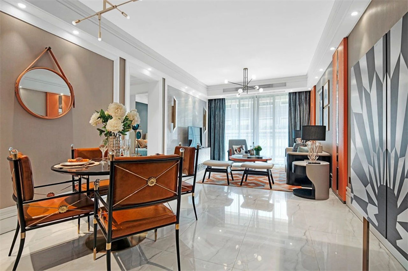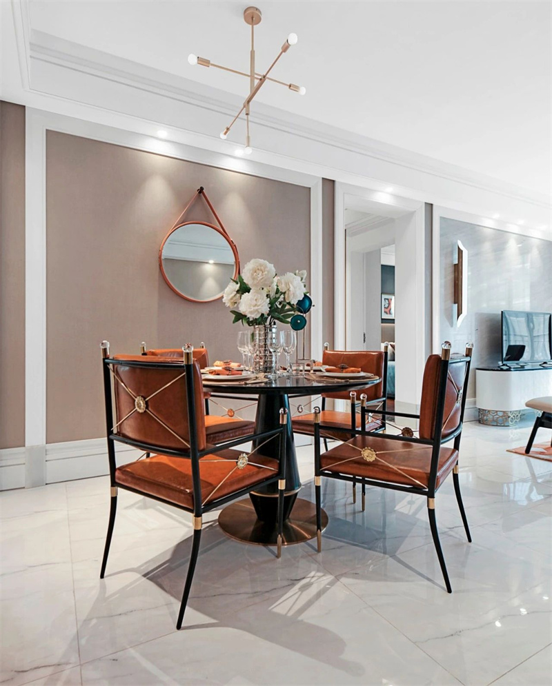 餐廳設(shè)計(jì)講究細(xì)節(jié)與品質(zhì)的融合。中央的餐桌簡(jiǎn)潔大氣,圍繞它擺放著幾張極具辨識(shí)度的愛馬仕橙色餐椅,與同色系的裝飾品相互呼應(yīng),為餐廳增添了一絲活力和時(shí)尚感。餐桌上精致的餐具與花藝裝飾,為每一餐的時(shí)光賦予滿滿的儀式感。