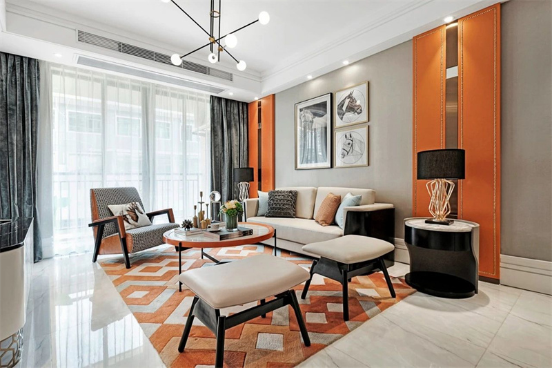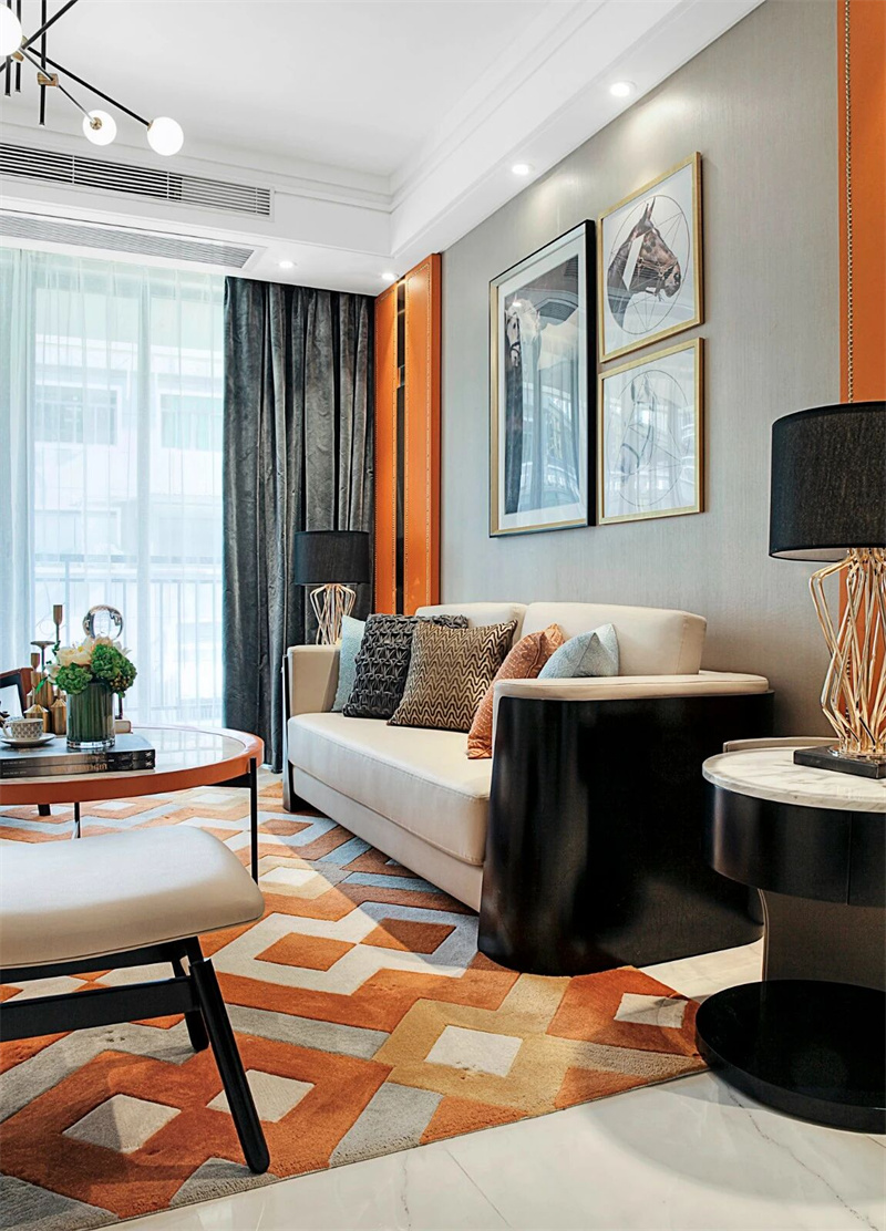 客廳的設(shè)計(jì)完美詮釋了法式輕奢的精髓,一張極具視覺沖擊力的愛馬仕橙色地毯鋪陳于大理石地面上,與淺米色的沙發(fā)和金屬質(zhì)感的茶幾形成鮮明對(duì)比,營(yíng)造出層次分明的視覺效果。柔和的燈光與古典裝飾掛畫,為整個(gè)空間增添了一份溫暖的浪漫氛圍。