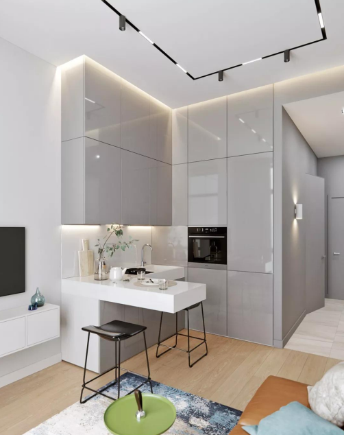 我們?cè)谛粜脱b修設(shè)計(jì)中因空間受限,時(shí)常難以妥善規(guī)劃,深圳裝飾公司雄宇裝飾便將公私領(lǐng)域一分為二,從玄關(guān)進(jìn)入即可看見(jiàn)一道墻隔開(kāi)客餐廳與臥室。公空間雖然狹小,但運(yùn)用斑駁藍(lán)白地毯便能簡(jiǎn)單作出區(qū)隔,此時(shí)搭配對(duì)比色深橘沙發(fā),就可輕易塑造視覺(jué)主焦點(diǎn),穩(wěn)定室內(nèi)不顯紊亂;廚房柜體則透過(guò)延續(xù)玄關(guān)淺灰色調(diào),借此連貫空間營(yíng)造寬敞感,料理區(qū)則保留簡(jiǎn)易烹調(diào)器具,深圳家庭裝修并且以L型臺(tái)面連結(jié)吧臺(tái)桌面拓展出精簡(jiǎn)用餐區(qū)。